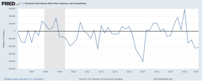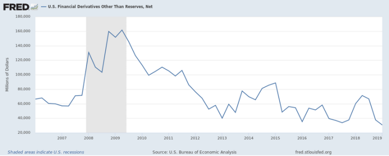 This next chart highlights the US financial derivatives net position and we can see the peak in 2008-09 and the dramatic deleveraging that has taken place over the past 8+ years. This chart shows the US financial derivatives levels are less than 25% of the levels from the start of 2008. ($31B vs $125B).