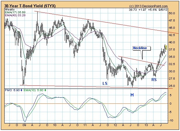 On the weekly bar chart, we can see how a reverse head and shoulders pattern is in progress and yield is headed toward a minimum upside objective of about 42.5. However, we also notice that the PMO (Price Momentum Oscillator) has reached its highest level since 2009, and that it has begun to decelerate. If the weekly PMO tops, yield will probably top as well.