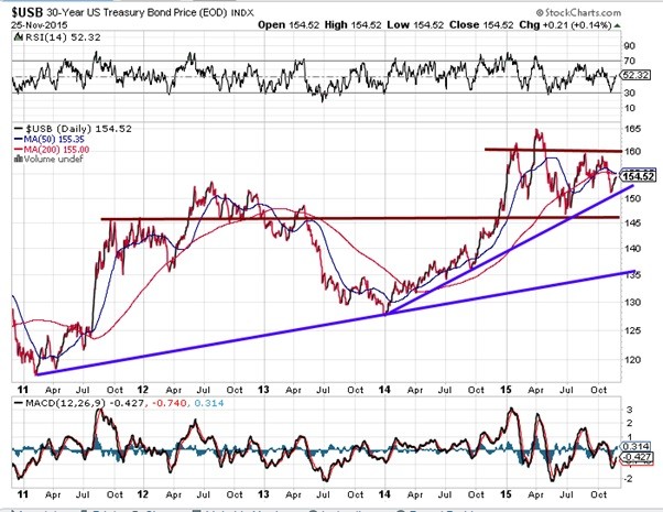 The trend in bonds was bullish for a long time, and one can see how bonds ran up during that time frame. Currently, its neutral and that also has to be viewed through a bullish lens as it should have turned negative given the run-up. Bonds need to close on a weekly basis above 160.00 relatively soon. In fact, there is a good chance that if the next run up fails to take out the August highs of 161-23, bonds will be paving the way for a move down to the 152.00 ranges and then 147-148 ranges. Traders willing to take on a bit of a risk could consider opening long positions at both levels. Some funds could be deployed at 152 or better and some at 148 or better. Market Update, Nov 1st, 2015.