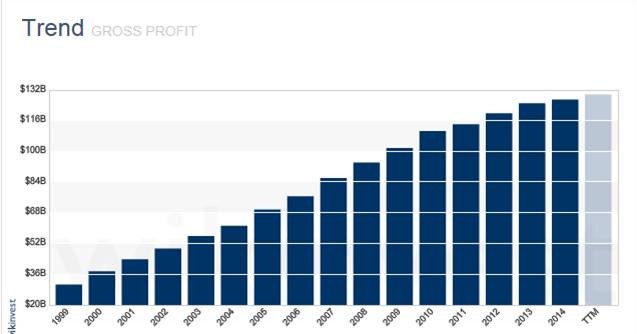Below is a chart of Wal-Mart’s Annual Gross Profit since 1999. It seems to me to be reaching asymptotic levels.