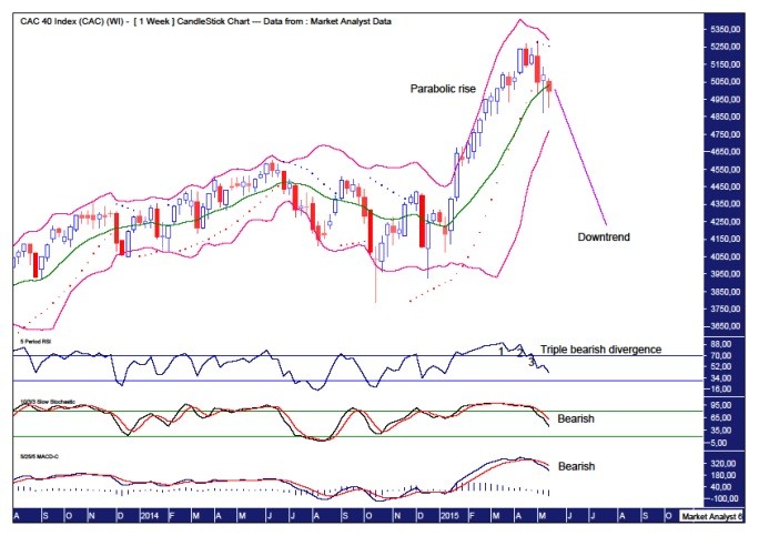 The French stock index, the CAC40, looks to have the final top to its bull market already in place. Let’s analyse the technicals using the weekly, monthly and yearly charts.