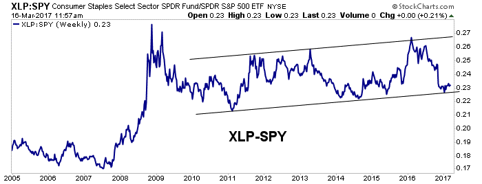 First, look at the Consumer Staples vs. the S&P 500 (weekly). In relative terms, it looks like XLP is at a buy point.