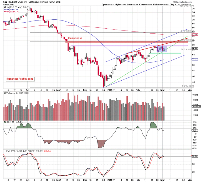 Yesterday, the rising green support line provided temporary relief to the bulls. Black gold moved higher but the lingering doubts as to the bulls’ strength remain. Namely, the price action left a sizable upper knot (which shows a kind of an intraday reversal) and also the volume of the upswing was lower than that of the decline (which has bearish implications).