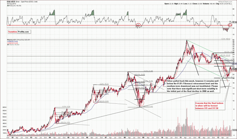 As you see on the above chart, gold verified the breakdown below the long-term resistance line created by the July 2005 and the October 2008 bottoms (taking intraday bottoms into account). At this point, it’s worth noting that there was an invalidation of the breakout above the 38.2% Fibonacci retracement level based on the September 2012 - June 2013 decline earlier this month. This was a bearish sign.