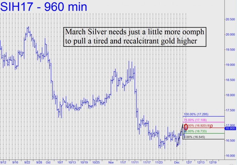 Although COMEX Gold offered no similar encouragement, March Silver’s rally on Monday was strongly impulsive, implying as it has that the futures are a decent bet to reach the 17.295 target within the next 2-3 days. Moreover, if buyers are able to push this vehicle just a nickel or so higher overnight, that would significantly shorten the odds the target will be achieved, perhaps as early as Tuesday night. A move above the red line is key, however, especially with gold futures in a funk.
