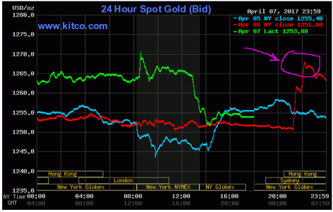 Of course, these headlines were dwarfed in importance by the two “Super PiMBEEB” stories of the day; starting with Thursday night’s U.S. attack on Syria – which, given the circumstances, and Russia’s stark opposition, may well catalyze a major Middle Eastern war. In my view, Trump’s 180-degree turnaround about Assad and Syria, in mere days, is barely different than what it took months for George Bush to perpetrate in Iraq 15 years ago; i.e, starting a war based on flimsy “evidence” of Iraq’s possession of weapons of mass destruction – which in hindsight turned out to be at best a red herring, and at worst a flat-out lie. Choose your own reason for why Trump decided to do this; but whatever the reason, this was the markets’ initial reaction; until of course, the Cartel stopped it with a patented “Cartel Herald” algo when the gold price rose just above its “daily limit up” level of roughly 1.0%.