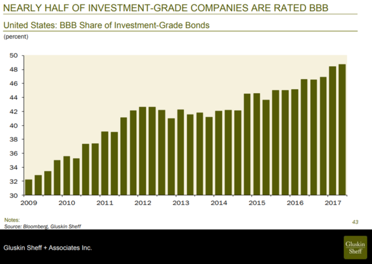 This low quality of corporate debt exists concurrently with a record level of debt as a percentage of the economy.