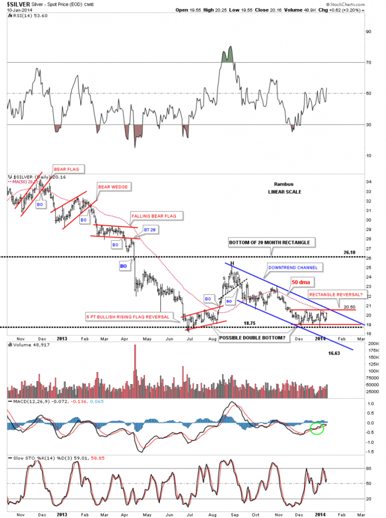 Let's start by looking at a daily chart for silver that we’ve been following for sometime now. As you can see since the beginning of December of 2013 silver has been chopping out a horizontal red trading range at the June 2013 low. This is the inflection point at least on a short to intermediate term perspective and it could also be on the very long term look that I’ll show you later in this Weekend Report. Note the blue downtrend channel and the 50 dma that is running parallel to it. Friday silver tagged the 50 dma. There are three overhead resistance points in which silver needs to overcome before it can move higher. There is the top rail of the red rectangle that will need to have at least 5 reversal points to make it a reversal pattern. Then there is the top blue rail of the downtrend channel and of course the 50 dma. So silver has its work cut out to get on the topside of these now resistance points. Note the June low took on the chart pattern of a red 5 point bullish rising flag before it broke out to the upside. Also the June low and our present low could be a significant double bottom for future reference.