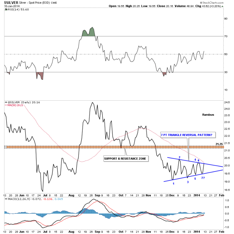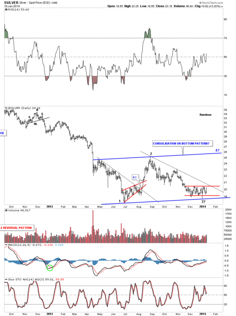 Let's look at one more daily chart for silver that shows our blue 6 month trading range. Notice how our most recent low was slightly higher than the June 2013 low. If we connect the two bottoms we get a slightly upsloping pattern. In my mind this 6 month trading range has to be one of three patterns at this point. As it only has completed two reversal points so far this tells me the consolidation pattern isn’t compete yet and we need one more rally up to the top blue rail to put in the 4th reversal point to make this trading range a possible consolidation pattern to the downside. The second possibility is this trading area is creating a H&S consolidation pattern with the smaller red patterns the left and right shoulders and the bottom blue rail would be the neckline. The third possibility would be this is a true double bottom which is a reversal pattern. As you know I always look for some type of reversal pattern such as a H&S, a double top or bottom or a 5 point pattern of some kind such as a rectangle, triangle or falling wedge to reverse the trend. This would be a place to see a possible double bottom.