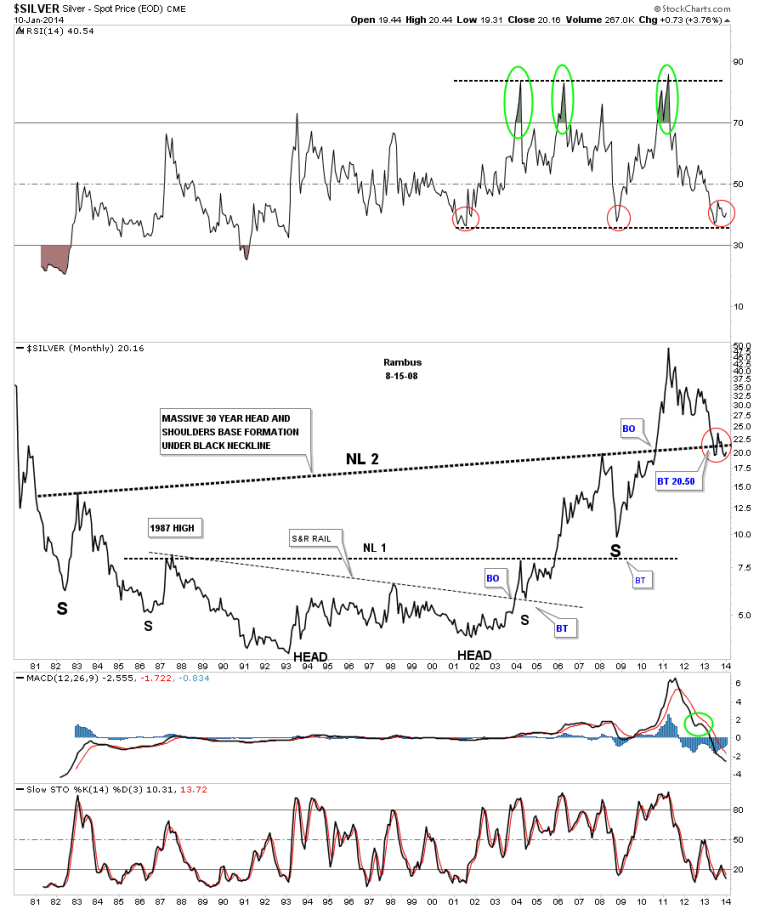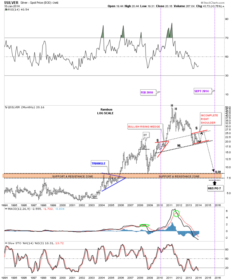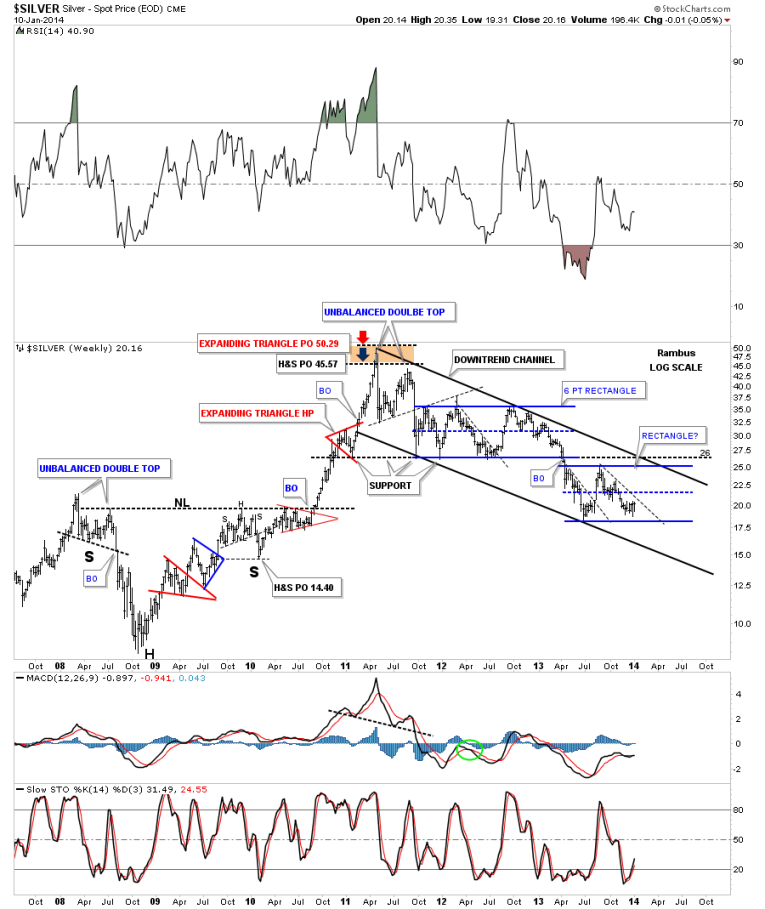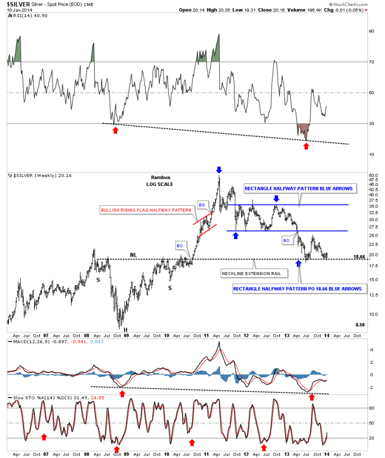 Now I want to show you a weekly chart for silver that puts a couple of things into perspective. First, why did the decline stop in June of 2013 at the 18 area. On this log scale chart you can see the blue 6 point rectangle was a halfway pattern as measured by the blue arrows. Another intriguing thing about his weekly chart is the neckline extension rail taken off the 2008 inverse H&S bottom that led to the parabolic move to fifty. This is basically the same neckline extension rail that I’ve shown you on the gold chart. So we have two very good reasons why silver stopped where it did in June and December of 2013. As you can see the neckline extension rail has reversed its role from resistance, back in 2008, to now support. All this chart tells is that there is a good reason why silver has found support where it has. That doesn’t rule out the fact that this is still a consolidation pattern in the making and move lower will resume once a 4th reversal point is completed. Note the little red bullish rising flag that showed me where to look for the top in silver back in April of 2011. Is our blue rectangle showing us the bottom for this bear market as it to is a halfway pattern?