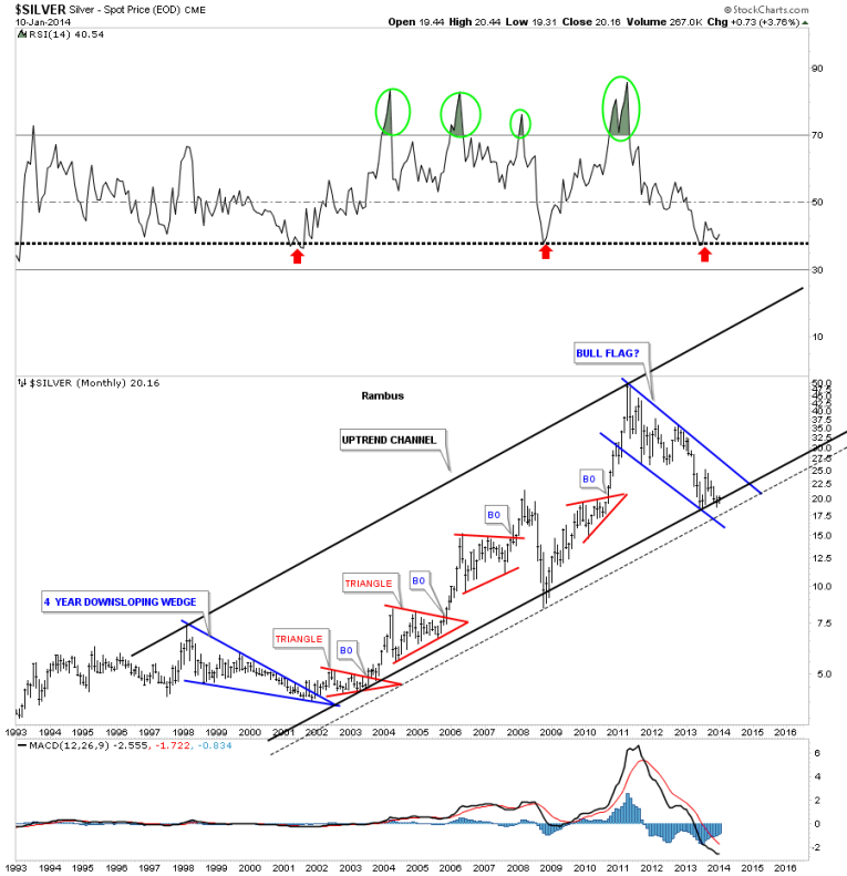 The very long term look at silver shows a possible parallel uptrend channel forming with just a slight break of the bottom rail which is shown by the dashed lower rail. The RSI at the top of the chart shows us this is the area where the previous two important lows came into play. I’ve labeled our blue downtrend channel as a possible bull flag which is the exact same width as the blue 4 year down sloping wedge that actually started the bull market once the price action broke above the top rail back in 2001.