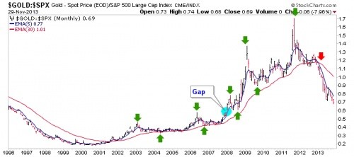 The chart of gold vs. the S&P 500 [below] shows a gap up in 2007, presumably as Lehman knocked down the first of many dominoes that would fall until the previously inflated cyclical bull market totally fell apart in Q4, 2008 and bottomed in Q1, 2009.