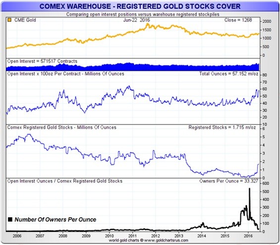 While the world awaits the BREXIT vote, the COMEX Registered Silver Inventories reached a new record as it pertains to leverage.  Matter-a-fact, the number of owners per ounce of Registered Silver is higher than gold.  In the beginning of the year, COMEX Gold Registered inventory owners per ounce spiked to over 500 to 1.