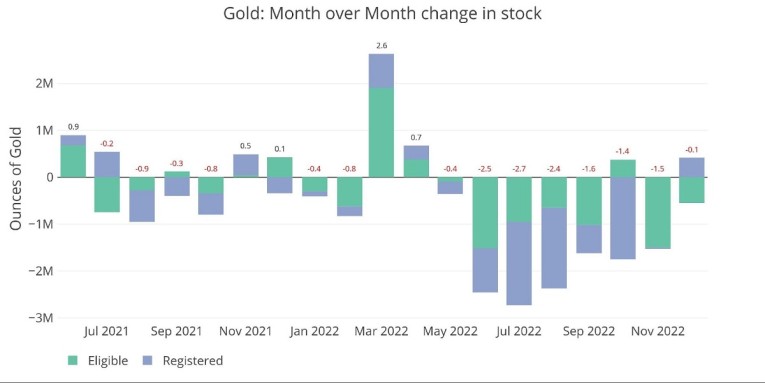 Gold is seeing its first increase in Registered inventory since April. That said, over December, there has been a mild net decrease in metal in Comex vaults of 100k ounces.
