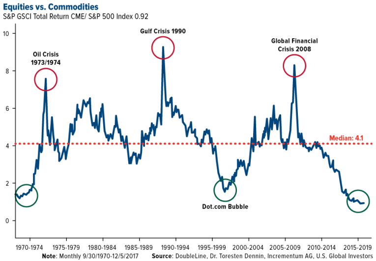 Speaking on CNBC’s “Halftime Report” last week, DoubleLine founder Jeffrey Gundlach said he thought "investors should add commodities to their portfolios” for 2018, pointing out that they are just as cheap relative to stocks as they were at historical turning points.