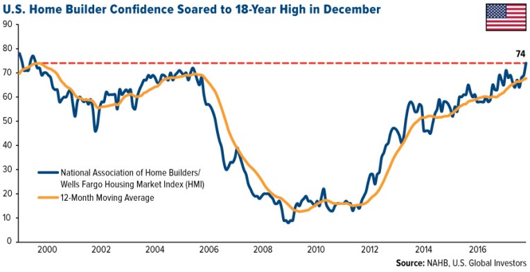 For one, home builders right now are more confident of the future than they’ve been in over 18 years. December’s National Association of Home Builders (NAHB)/Wells Fargo Housing Market Index (HMI) soared to 74, eight points up from the November reading and its highest report since July 1999.