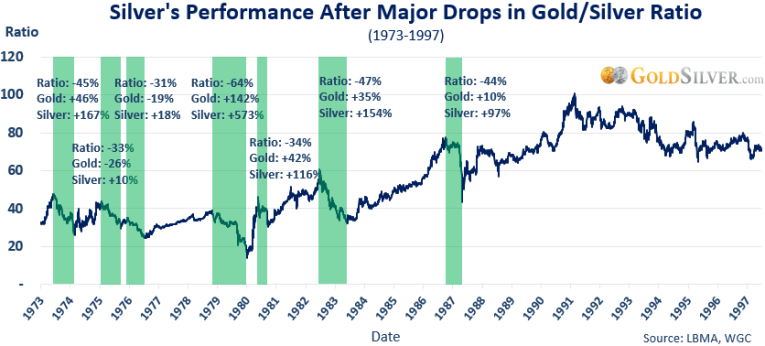 Of the five major declines in the gold/silver ratio, the silver price gained triple digits in three of them, and 80%+ gains in the other two.
