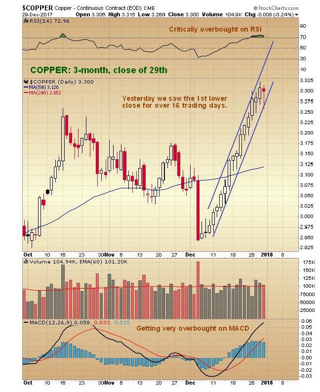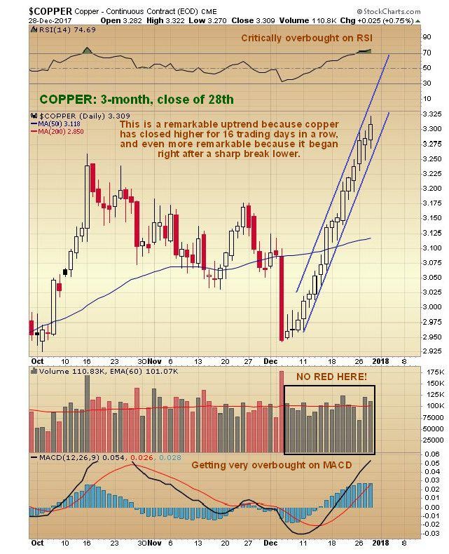 We have seen an unusually steady uptrend in copper this month, which has resulted in it appreciating by about 10%. That might not sound like much, but makes a big difference if you are a producer with fixed costs. What is remarkable about this uptrend is not only that it came hard on the heels of a high volume smack-down in the early days of the month that at the time looked bearish, but that we have seen 16 days trading days in a row of higher closes as of the close of trading on Thursday, as can be seen on the 3-month chart for copper shown below. After doing some extensive research it has been discovered that the fundamental reason for this day after day seemingly interminable uptrend was that a prominent Chinese buyer, who has an old fashioned way of doing things, was walking over to the London Metals Exchange every day for weeks with his black briefcase in hand and buying roughly the same amount of copper…