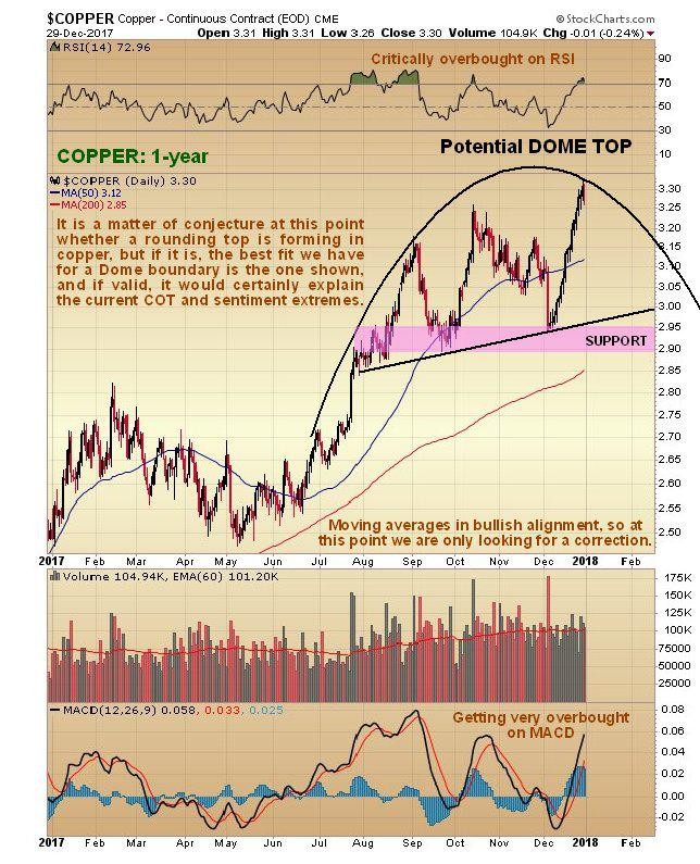 We will now zoom out to look at copper on its latest 1-year chart. On this chart we can see that, while copper still has not broken down from its steep uptrend in force all this month, it is getting very overbought on its MACD and RSI indicators and is quite a long way ahead of its 200-day moving average, and these factors, taken together with the now extreme COT structure and sentiment indicators that we will look at shortly, suggest a high chance that it will go into reverse here or very soon and react back.