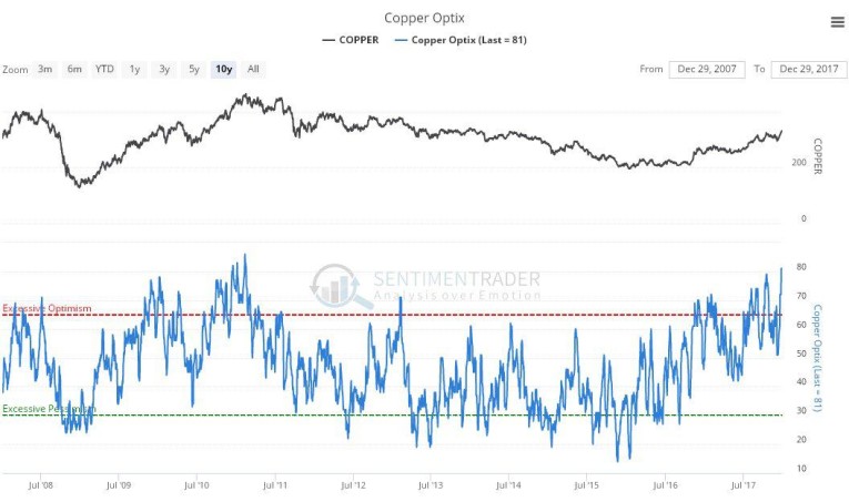 On the latest copper optix, or optimism chart, we can see that bullish sentiment towards copper is at the sort of wild extremes that we have only seen once before in the last 10 years, and that coincided with a major top. This is not to say that it does this time, but it would certainly seem to indicate a high probability that we are at or close to a significant intermediate (medium-term) top.