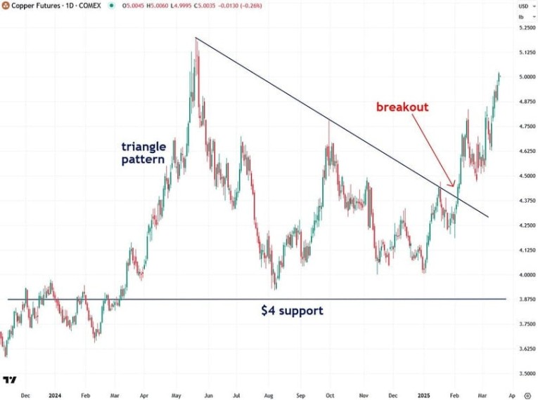Let’s dive into copper’s technicals, starting with the daily chart. In late 2024, copper found strong support at the key $4 per pound level, rebounded, and then broke out of a triangle pattern at the start of February.