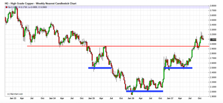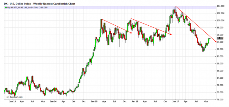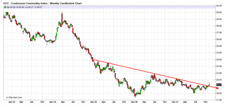 The key to any commodity rally is weakness in the US dollar. Most commodities trade in dollar terms so a rising dollar generally puts pressure on the sector. In contrast, a falling dollar is usually good for the sector. As you can see in the chart below, the general trend since 2015 has been a flat to falling US dollar as measures by the Dollar Index: