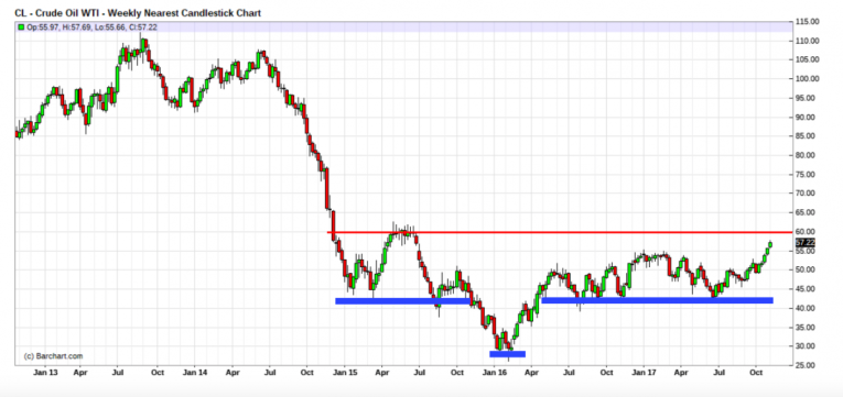 And now look at WTI crude oil. Note the similar chart pattern to copper. Could a move into the $60s be construed as a breakout and renewed bull market after a three-year bottoming process?