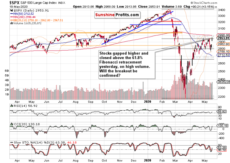 Steadily rising in the runup to the start of the US session, stocks opened with a sizable bullish gap. And they haven’t looked back since, closing on high volume above the key resistance, the 61.8% Fibonacci Retracement. Reflecting the upswing, the daily indicators turned largely supportive.