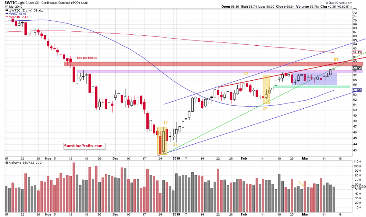 (…) Yesterday’s session brought us another day of crude oil price gains, marking a fresh March peak. While not minuscule, the accompanying volume was still lower than the day before. The jury is still out but we lean towards the bearish implications thereof.