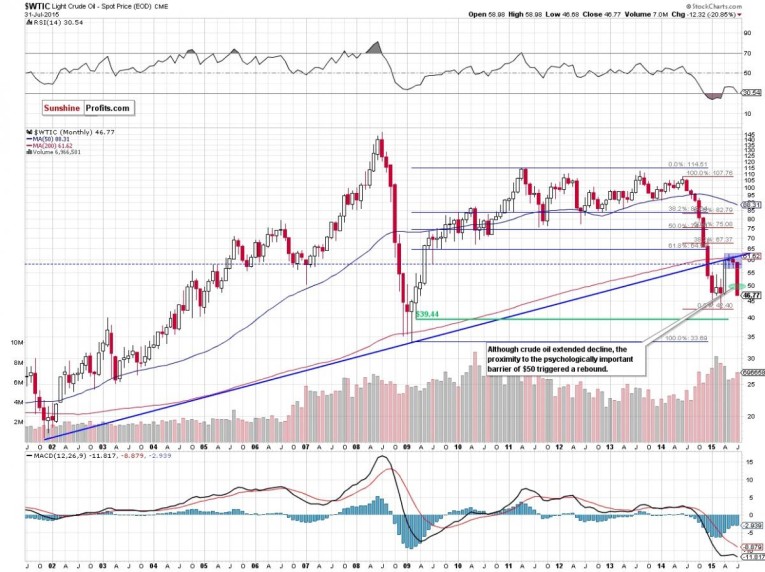 Summing up, July was the worst month for the commodity since the beginning of the year. In this period of time, crude oil lost 20.85% (trade (we entered the short position on May 8 when crude oil was trading at about $59) and broke below the Apr low, closing Friday's session at its lowest level since Mar 20. This confirms that the downtrend remains in place and suggests that lower values of the commodity are ahead us.