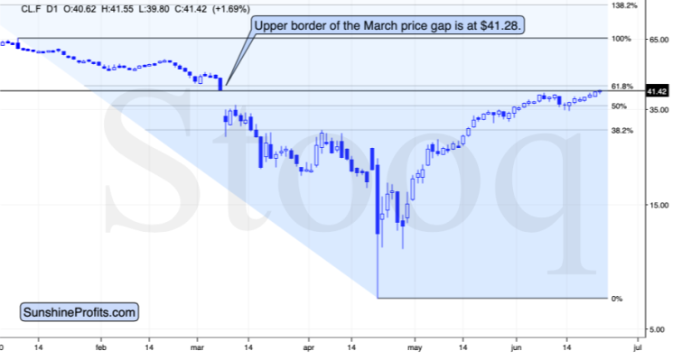 The upper border of the March price gap is one of the most important resistance levels nearby. There’s also the 61.8% Fibonacci Retracement level, but since it’s based on the April low that is relatively unclear (different series of futures contracts were trading at very different price levels, some were even in the negative territory), the Fibonacci retracement might not be as reliable as the price gap.