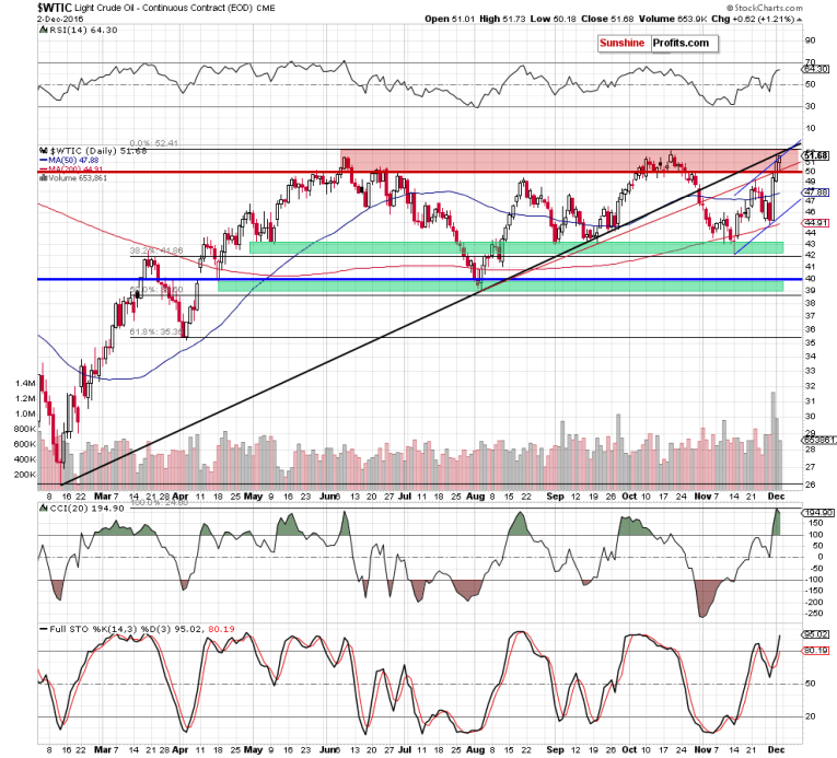 On Friday, crude oil gained 1.21% as OPEC deal continued to support the price of the commodity. In this environment, light crude re-approached the Oct high. Will we see fresh 2016 peak in the coming week?