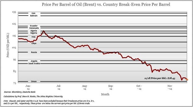 In addition to the Russian-Ukrainian conflict, the ruble has been put under pressure because of the recent slide in the price of oil. As the accompanying chart shows, Russia’s fiscal accounts balance when the price of oil is about $102 per barrel. If the present price of less than $80 per barrel persists, it will put most oil producers, including Russia, in a fiscal squeeze.
