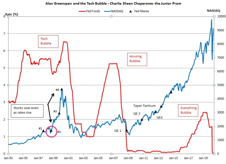 The 23rd anniversary of the Greenspan Fed's emergency rate cut on October 15, 1998 went unnoticed by markets and the financial media. This is remarkable because this emergency rate cut laid the basis for everything that came after it; namely the generation of an enormous bubble in tech stocks, an even larger housing bubble and finally a still larger "everything" bubble. (Note: the designation of the rate cut as 'emergency' is the result of the rate cut occurring between regularly scheduled meetings of the Fed's Open Market Committee, FOMC.)