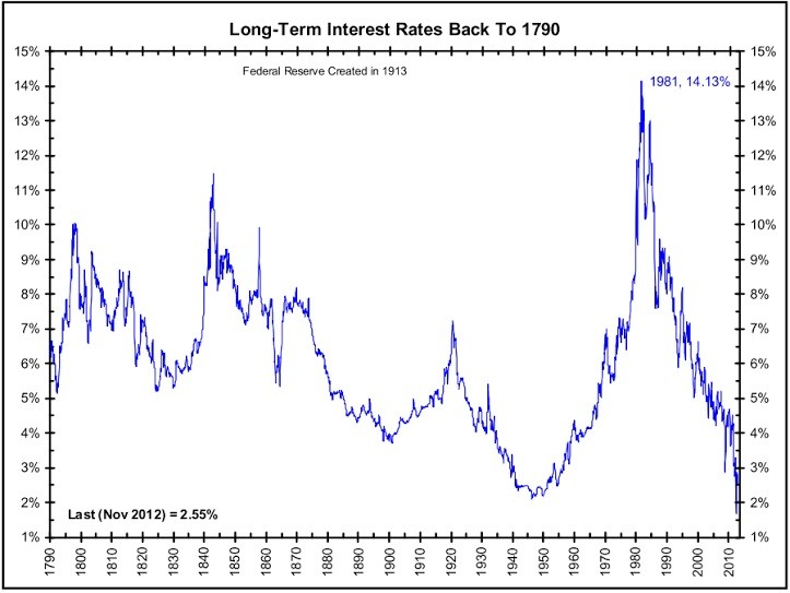 The following graph, created by Barry Ritholtz (http://www.ritholtz.com), shows long-term interest rates going back to the year 1790. Of special significance, notice how the 60-year Kress cycle of inflation/deflation can be tracked beginning around the mid 1890s (when the current 120-year Super Cycle began) before peaking approximately on schedule in the 1920s. This was followed by a 30-year cycle into the early 1950s, followed by another 30-year advance into the early 1980s – just as the Kress cycle predicted. The last 30 or so years, of course, have been marked by dramatically falling interest rates in reflection of the deflationary phase of the 120-year cycle.