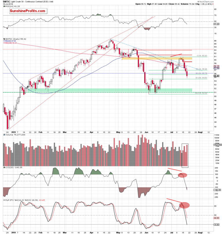 (…) Crude oil has finished yesterday’s session sharply lower, slipping below $58 and making our short position even more profitable. That also marks a close below the 50-day moving average, which is another bearish factor to boot.