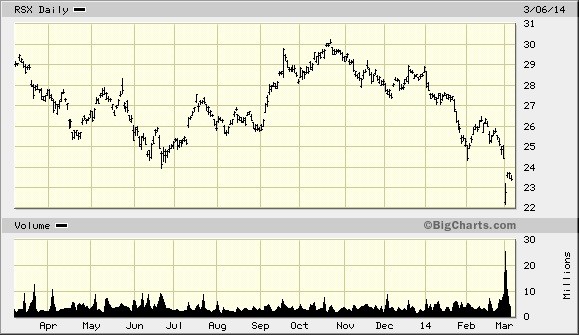 Russia is currently the focus of Wall Street’s worries right now. One of the better proxies for Russia’s stock market is the Market Vectors Russia ETF Trust (RSX), which lost nearly 7% in value on Monday. RSX made a 4-year low today which underscores the political and economic troubles facing that region of the globe.
