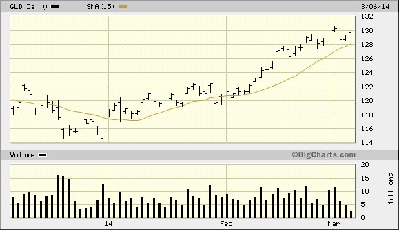 Meanwhile the rush into the safe havens continues unabated as investors are clearly concerned over the developing overseas market and political woes. The iShares 20+ Year Treasury Bond ETF (TLT), our bond proxy, continues trending higher and recently tested its previously high from Feb. 3 when investor fear was spiking. Gold meanwhile also continues its recent surge and made another new high for the year on Mar. 3, as seen in the SPDR Gold Trust ETF (GLD) below.