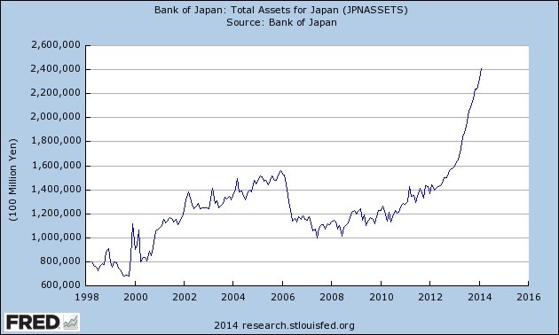 Japan’s Nikkei stock index peaked in 1989 and the country entered a bear market and deflationary depression lasting some 20 years. Only in the last year or so has inflation finally shown signs of life after a record-breaking amount of liquidity created by the Bank of Japan. Shinzo Abe, the architect of Japan’s re-inflationary monetary policy, has thrown everything but the kitchen sink at the country’s economy in hopes of fighting deflation. As it stands the efforts have been only mildly successful by historical standards; indeed, Japan’s inflation rate is up only 1.4% from last year despite a 56% year-over-year increase in the monetary base.
