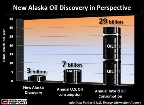 Regardless, the amount of oil the company claims they can ultimately recover in their new Alaskan discovery is about three billion barrels. While this may sound like a lot of oil, it’s peanuts when we compare it to total U.S. and world oil consumption:
