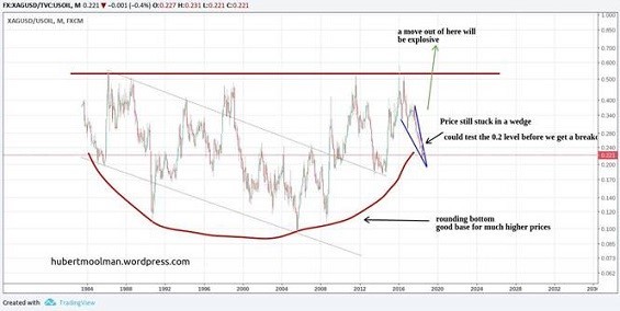 Above, is silver priced in oil from 1983 to now. Price has moved in a large channel before it broke out at the end of 2014. This is really significant given the length of time involved.