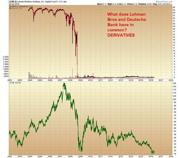 Interesting Historical Note: When Lehman Brothers failed, it had $35 Trillion in Derivative Exposure. Now compare this with today’s Deutsche Bank Derivative Exposure of a cardiac-arrest $75 Trillion in DERIVATIVES…and you will understand WHY DB share value is relentlessly and methodically falling in recent years. In fact, today May 3rd, Deutsche Bank stock has already been hammered down more than 6% in today’ early hours of New York trading.