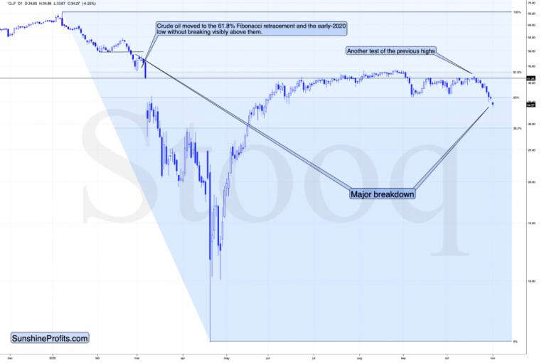 First of all, crude oil stopped rallying after correcting approximately 61.8% of the previous 2020 decline, which means that it was quite likely a real top instead of a fake one that will be broken shortly.