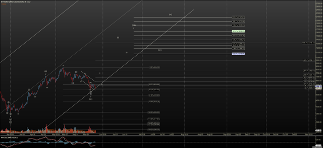 Next, we need to see a 5-wave move, and the probability of a bottom being in rises if prices retrace .618 of the correction. Key levels to the upside are $719 in Ethereum and $8,910 in Bitcoin. In that regard, we have work to do. But I am, as of writing, tracking a potential nano 5-wave move in both.