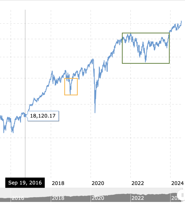 Note the dip in the orange box. At the time, the Federal Reserve was trying to normalize interest rates after nearly a decade of artificially low rates in the wake of the 2008 financial. The Fed held rates at zero through most of that period. During that time, the trajectory of the Dow was generally upward.