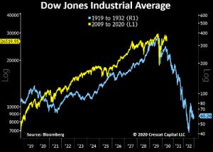 The chart above (from Crescat Capital) shows an analog that compares the Dow between 1919-1932 and 2009 to the present. The key underlying factors that drove the stock market in both time periods to an insanely overvalued top…and subsequent descent are worse now than back in the 1920’s/early 1930’s: Currently stocks have higher multiples, the global economy is more leveraged and Central Banks have created a far bigger systemic imbalance now vs. then.