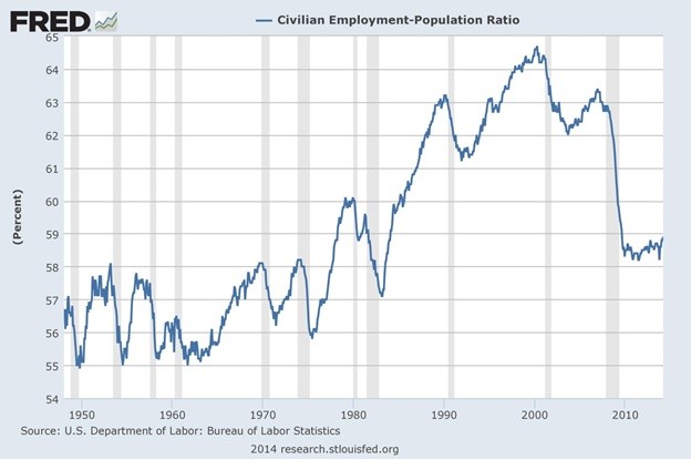 Why has the level of employment in the US been falling? One would think that with a growing population and supposedly an economy that is improving that more of the population would be employed. It is not the case at all. Instead, the level of civilian employment to the population as a whole has been falling since 2000. It currently sits at levels not far above the high of the 1950’s and 1960’s a period when it was considered fairly normal that in a household the husband worked while the wife stayed home. (Note as well the rather interesting head and shoulders top pattern that formed at the top. It projected that the civilian employment population ratio would fall to at least 59. It is currently 58.9).