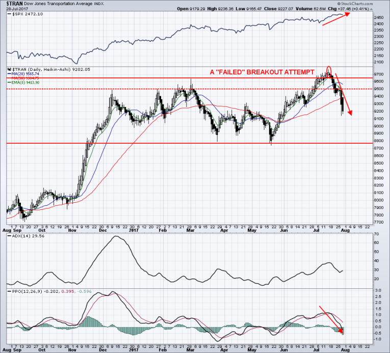The divergence which is currently being seen between the Dow Industrials and Dow Transportation indexes will be coming into play in the upcoming weeks.