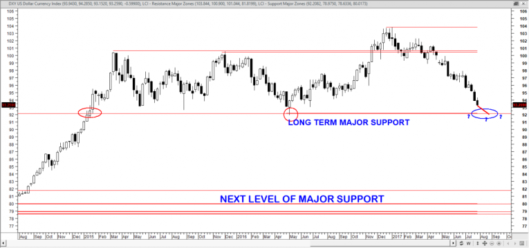 The US dollar has declined to a 52-week low. When stocks have been at a high and the dollar at a low, historically, the SPX showed a positive return within six months to one year, almost without exception. I see support in the 92.50 area.