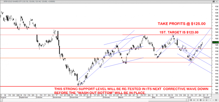 I would expect to see a very quick “oversold” bounce in GLD, then a correction to the 105 to 107 areas as the final “washout bottom” is put into place.
